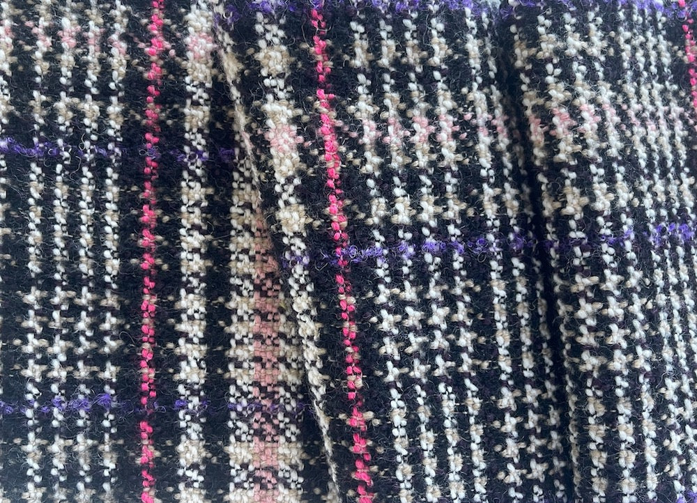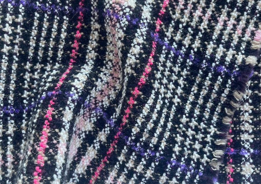 Dynamic Plaid Black, White, Carnation & Phlox Wool Blend Bouclé (Made in Italy)