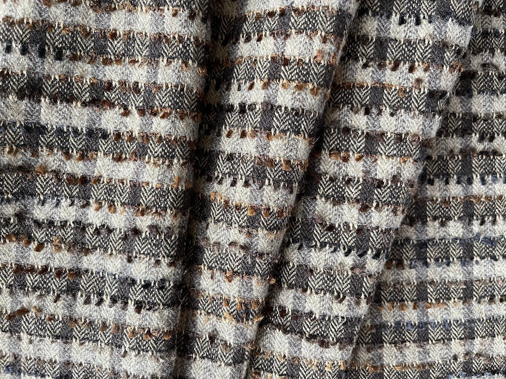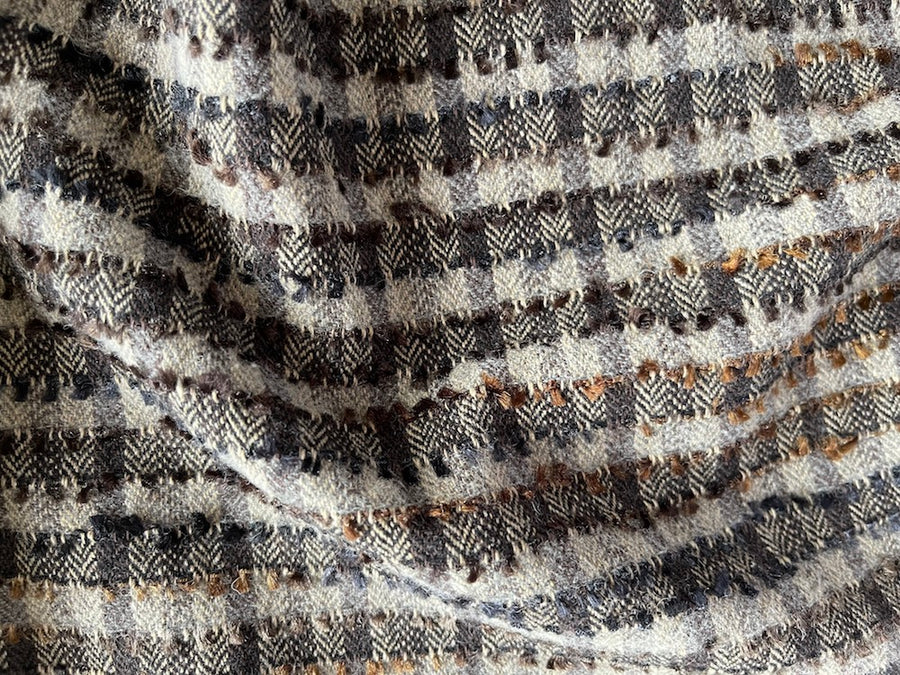 A wool blend bouclé in a small-scale plaid in shades of black, mahogany, Oxford grey, camel, and bronze - this elegant wool is fabulous for a chic jacket or fitted frock. Made in Italy. 90% wool and 10% poliamide blend. 56" wide.