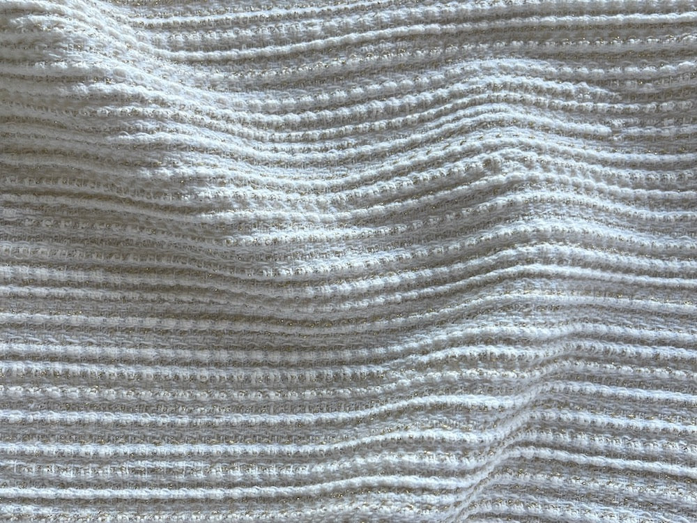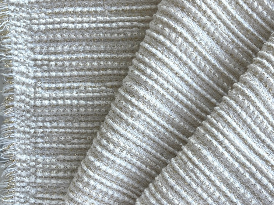 An ethereal woolen blend bouclé in soft alabaster interwoven with sparkling gold metallic threads - this stunning bouclé is perfect for lovely dresses, a loose tunic top, or a fitted jacket. Made in Italy. 40% wool, 30% poliamide, and 30% viscose. 60” wide.