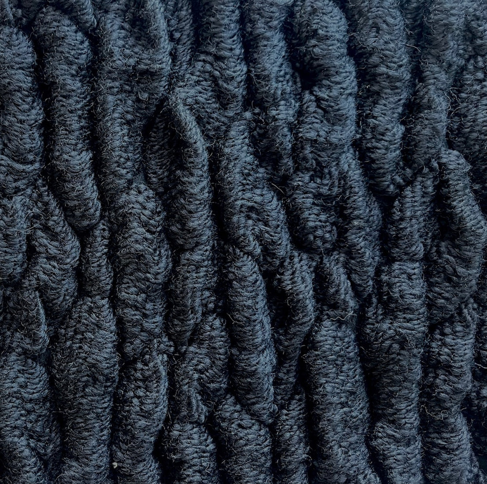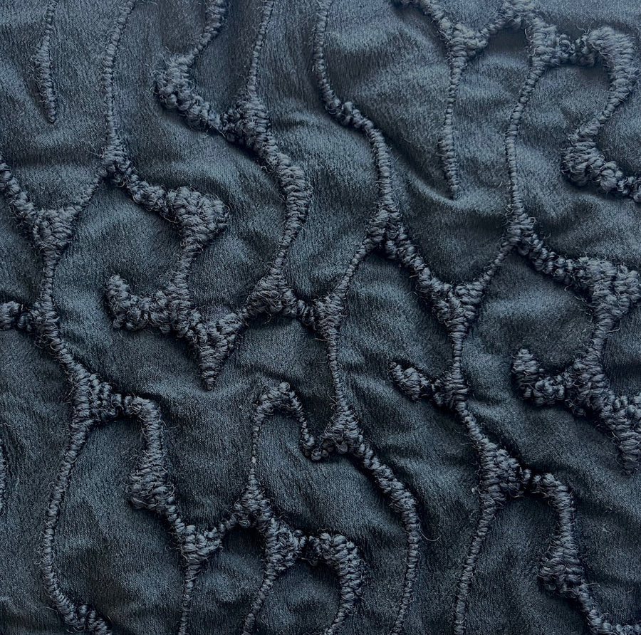 A couture mid-weight silk blend bouclé tweed with black embroidered stratified scroll-work on one side and black faux astrakhan fur on the reverse - with a hint of lycra, this elegantly exquisite bouclé is reversible, making it perfect for a Chanel-style jacket, a skirt, a bolero, or a simple dress. Made in Italy. Silk, poliamide, and lycra. 28" wide.