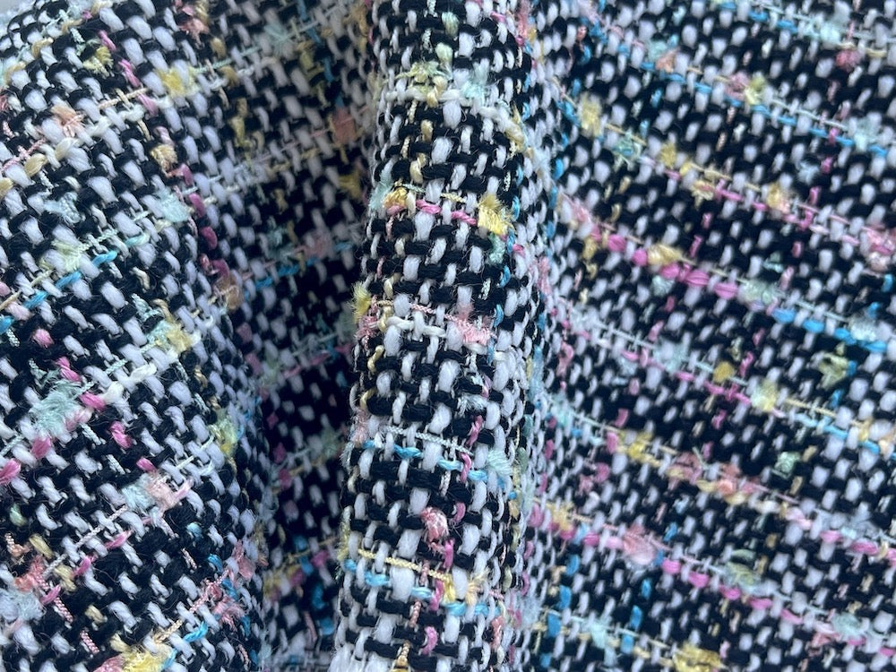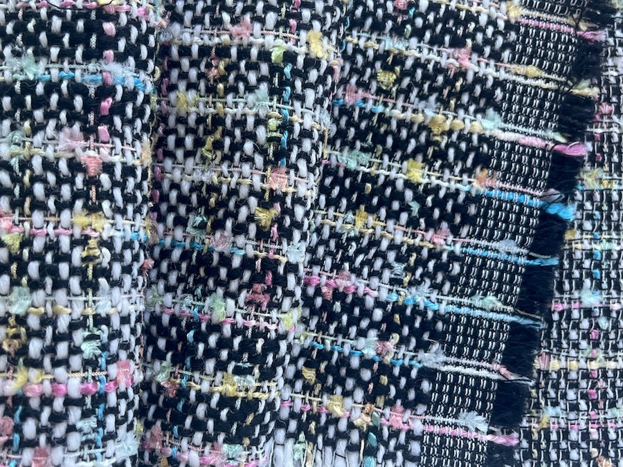 A  soft, mid-weight woolen blend tweed bouclé of alternating crosswise stripes in black and white, and sweet shades of pastel party mints - this flexible bouclé  is perfect for stylish jackets, a loose tunic top, or a striking wrap. Made in Italy and used by Gucci. 80% wool, 10% cotton, and 10% acrylic. 56” wide.