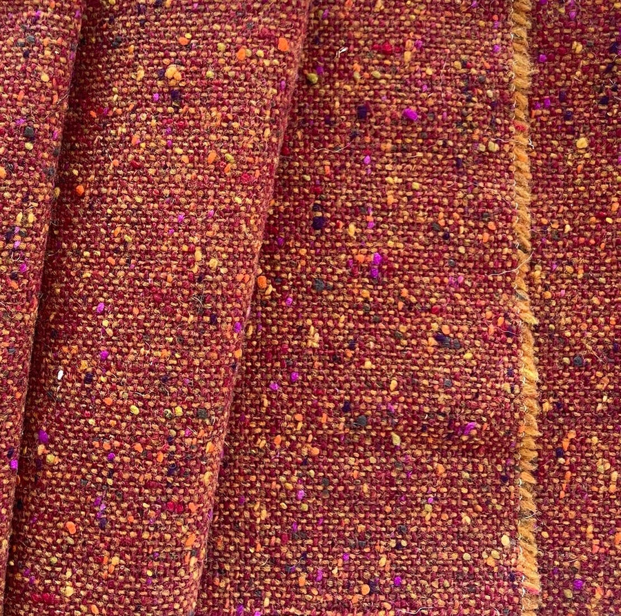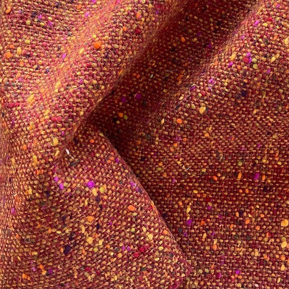 A light to mid-weight wool tweed in brick and butternut with subtle violet, mango, fuchsia, and lime flecks - this woolen tweed is perfect for pants, straight skirts, or a tailored jackets. Made in Italy 100% wool. 60" wide.