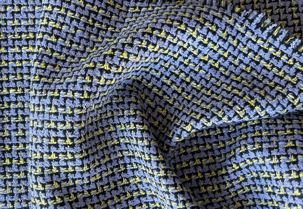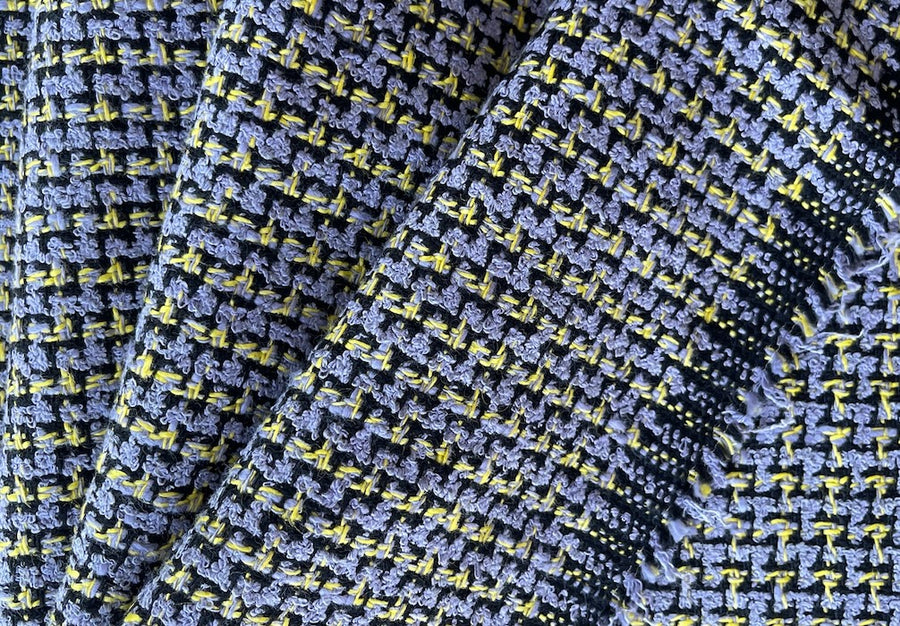 A wool and cotton blend bouclé in warm weather shades of lemon and lilac, with a touch of black for sophistication - this knotty wool bouclé has a soft hand and is perfect for a Chanel-style suit, a skirt, or a simple dress. Made in Italy. 60% wool, and 40% cotton. 61" wide.