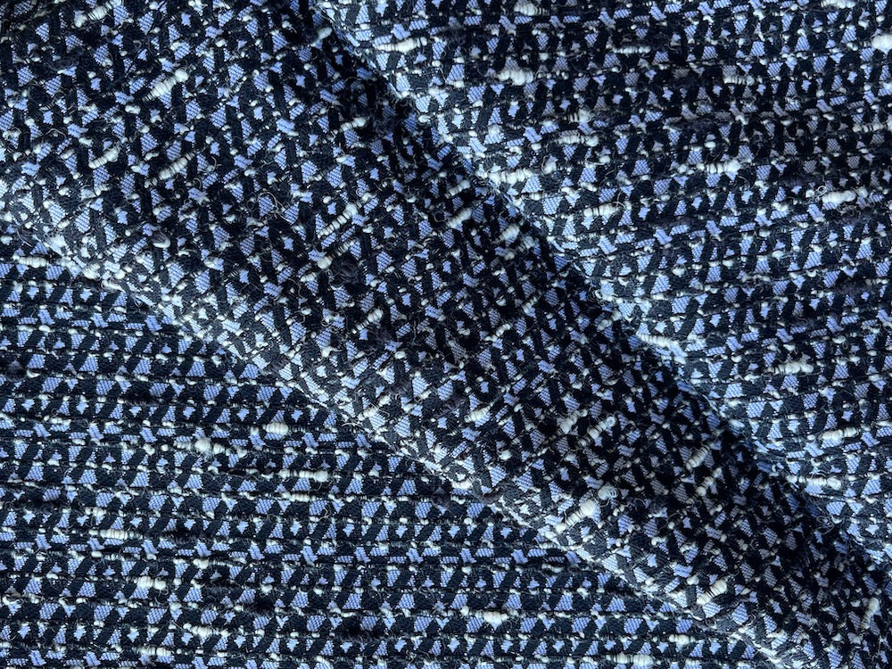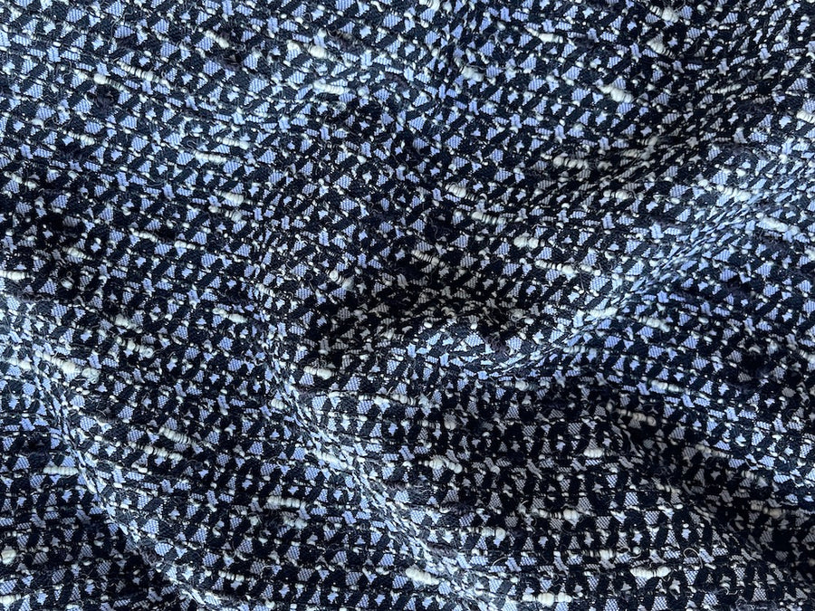 A light-weight tweed bouclé in cool shades of periwinkled lavender, pale ivory, and black - this loosely woven bouclé with intricate ribbon-work is perfect for a French, couture-style jacket, light-weight coat, or sheath dress. Made in Italy. 70% polyester, 15% wool, and 15% acrylic blend. 54" wide.