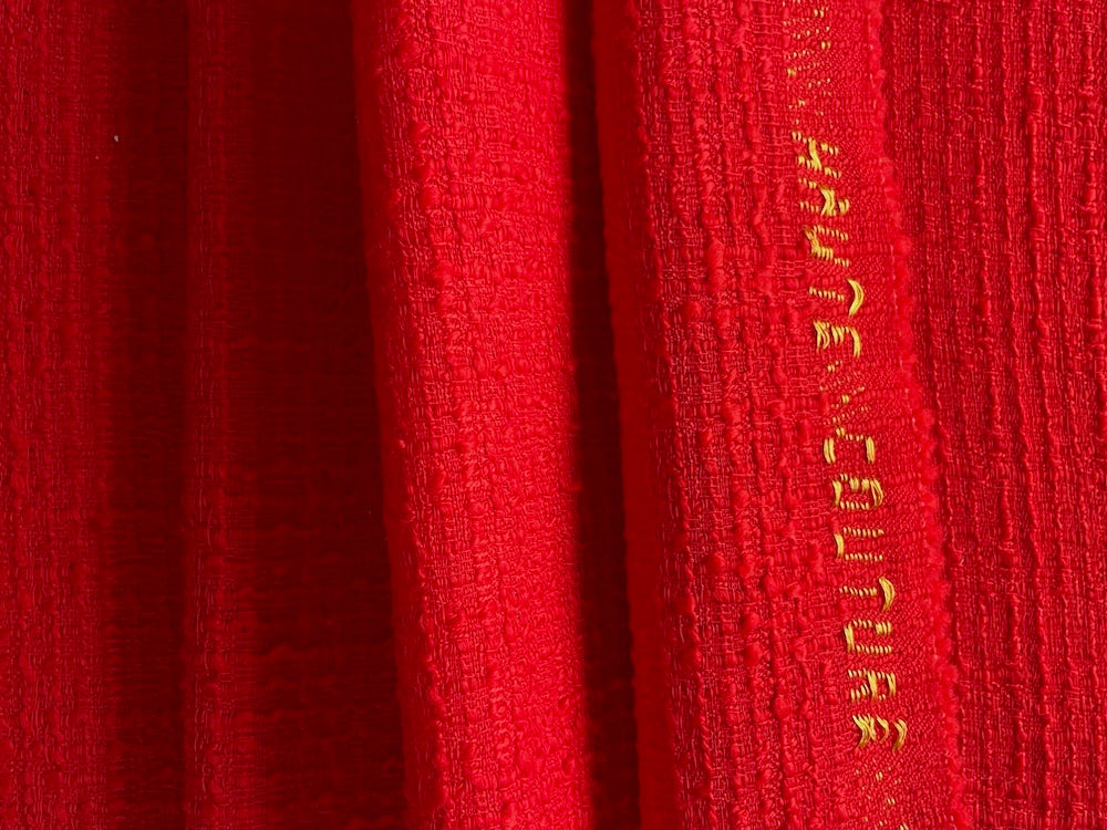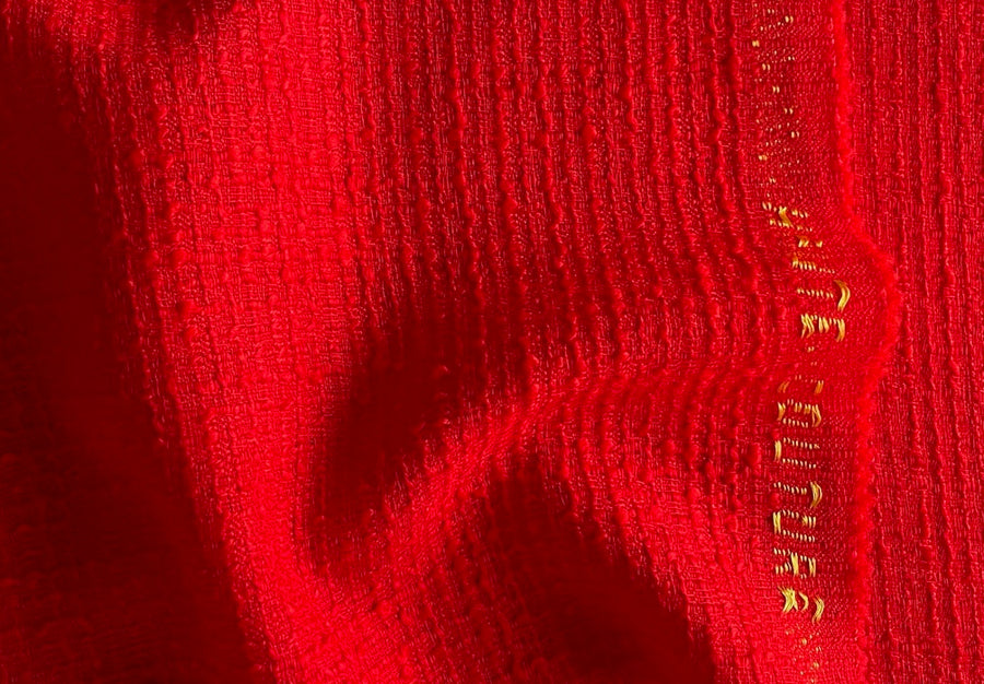 A high-end textured wool bouclé in brilliant candy red- this vibrant wool bouclé is perfect for a Chanel-style suit, a skirt, or a stunning jacket. Made in Italy. 100% wool. 60" wide.