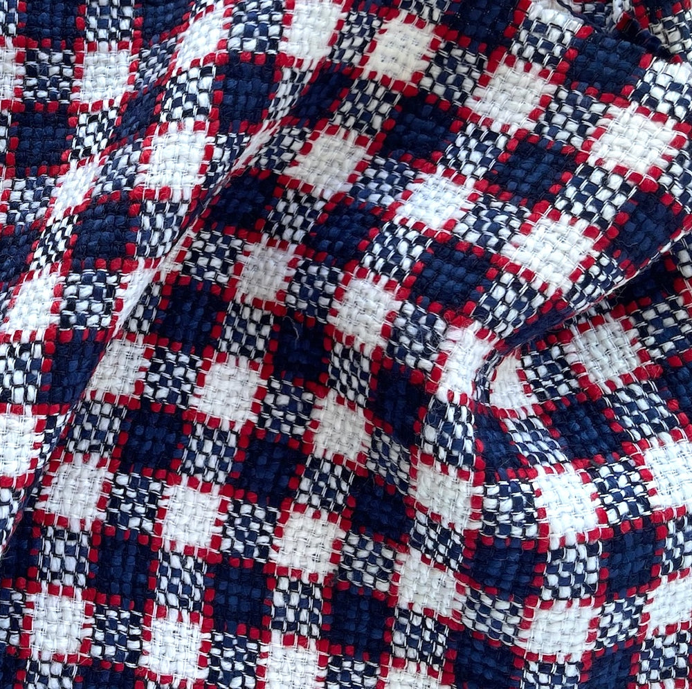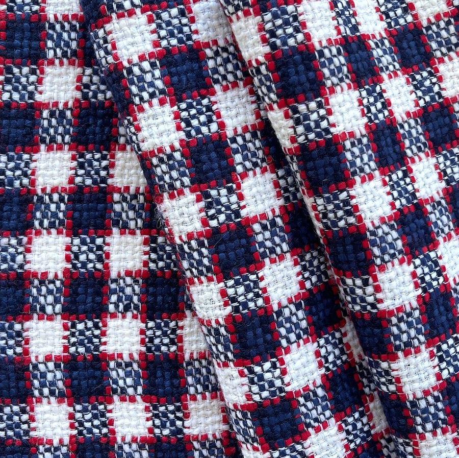 A mid-weight wool bouclé in a summery red, white, and blue check - easy going and striking, this bouclé is perfect for a coat, a Chanel-style jacket, or a skirt. Made in Italy. 55% wool, 35% acrylic, and 10% cotton. 60" wide.