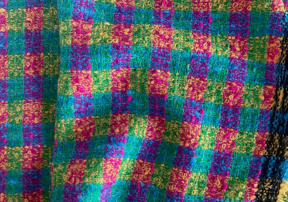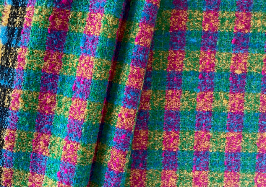 A chic wool bouclé check in shades of summery, bright grass green, turquoise, hot pink, and marigold yellow - this cheery wool bouclé is perfect for a sheath dress, a cropped jacket, or an a-line skirt. Made in France. 100% wool. 54" wide.