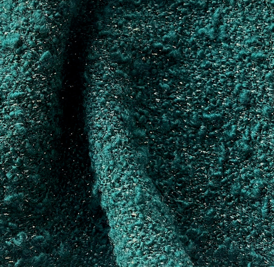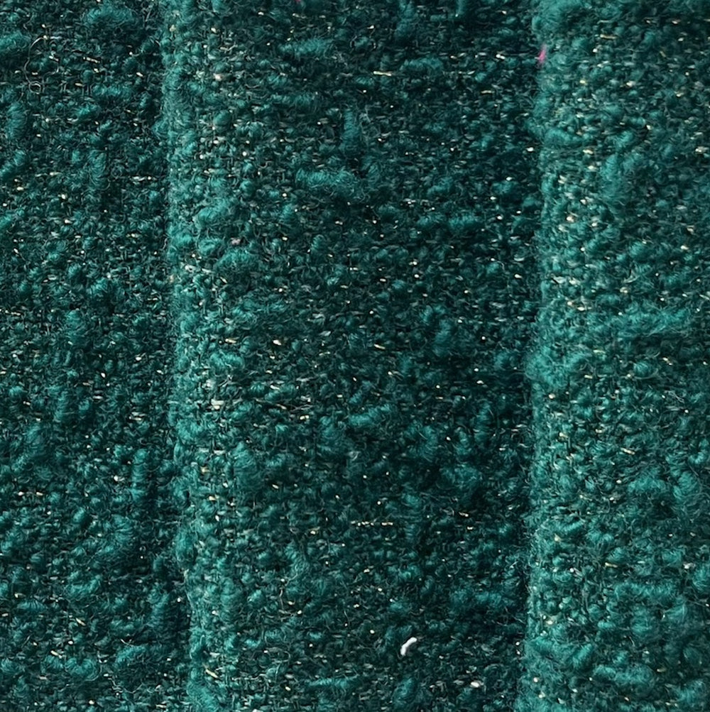 A mid-weight textured wool blend bouclé in spruce green with subtle glimmery metallic accents - this classic, bouclé is perfect for a French couture-inspired suit, a jacket, or a dress. Made in Italy. 90% wool, 6% poliamide, and 4% polyester. 54" wide.
