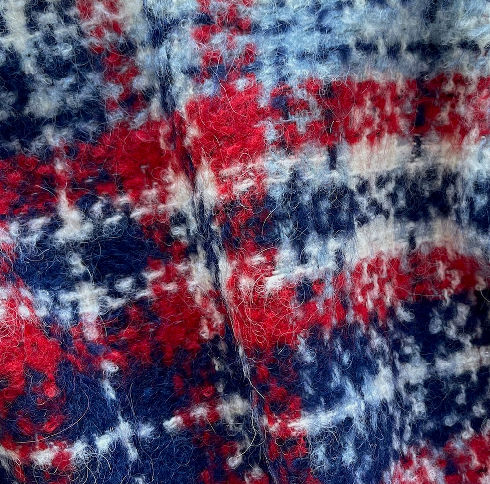 A mid-weight wool bouclé in a red, white, and blue plaid - this pettable, fuzzy bouclé is perfect for a coat, a Chanel-style jacket, or a wrap. Made in Italy. 85% wool and 15% acrylic. 60" wide.
