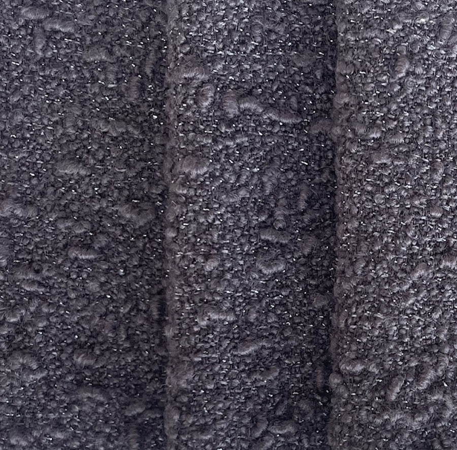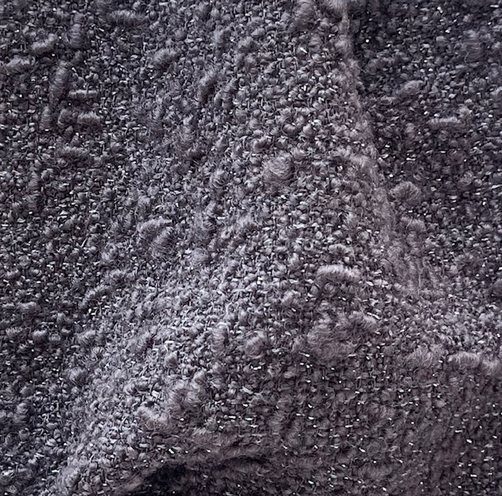 A mid-weight textured wool blend bouclé in a unique shade of graphite fog (grey-brown) with subtle glimmery silver metallic accents - this classic, bouclé is perfect for a French couture-inspired suit, a jacket, or a dress. Made in Italy. 90% wool, 6% poliamide, and 4% polyester. 52" wide.