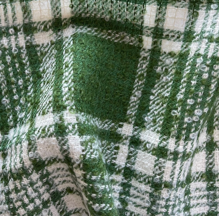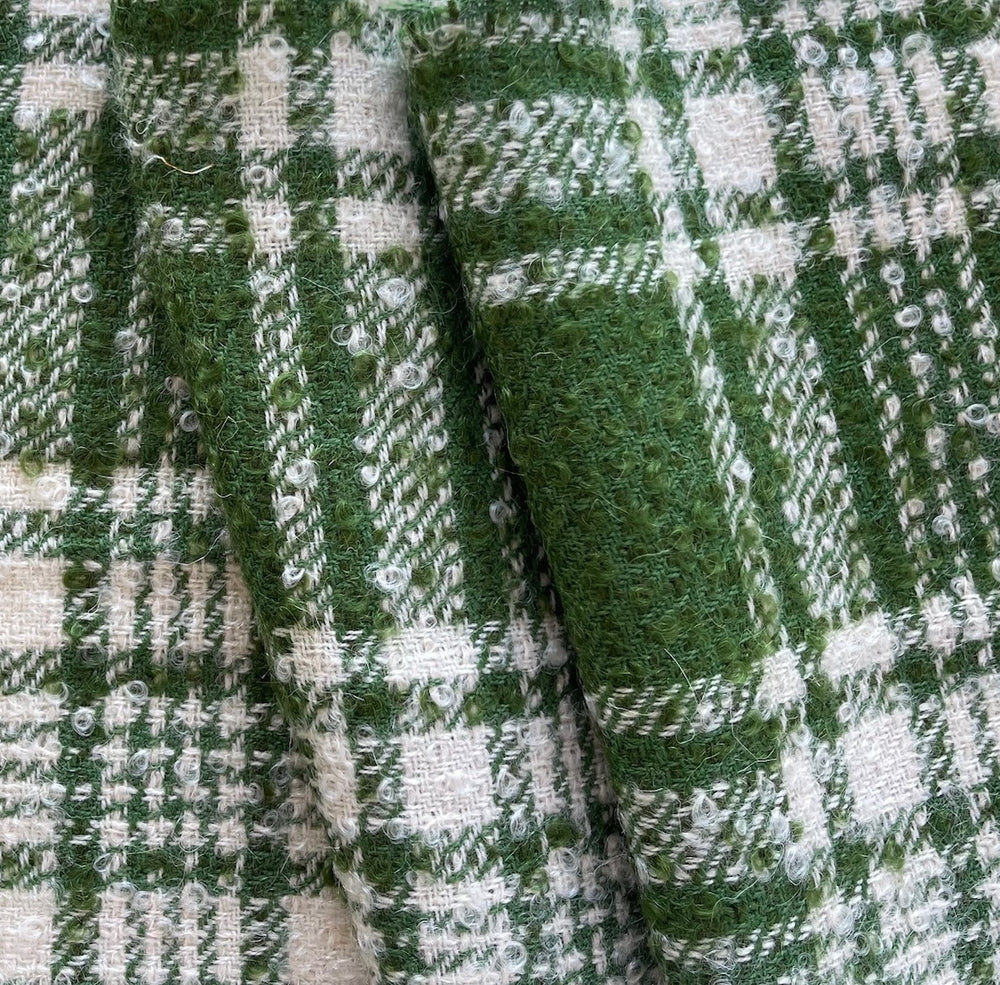 A mid-weight wool bouclé in a fresh basil and parchment textured plaid - this cozy, pliable bouclé is perfect for a coat, jacket, or a cape. Made in Italy. 100% wool. 58" wide.