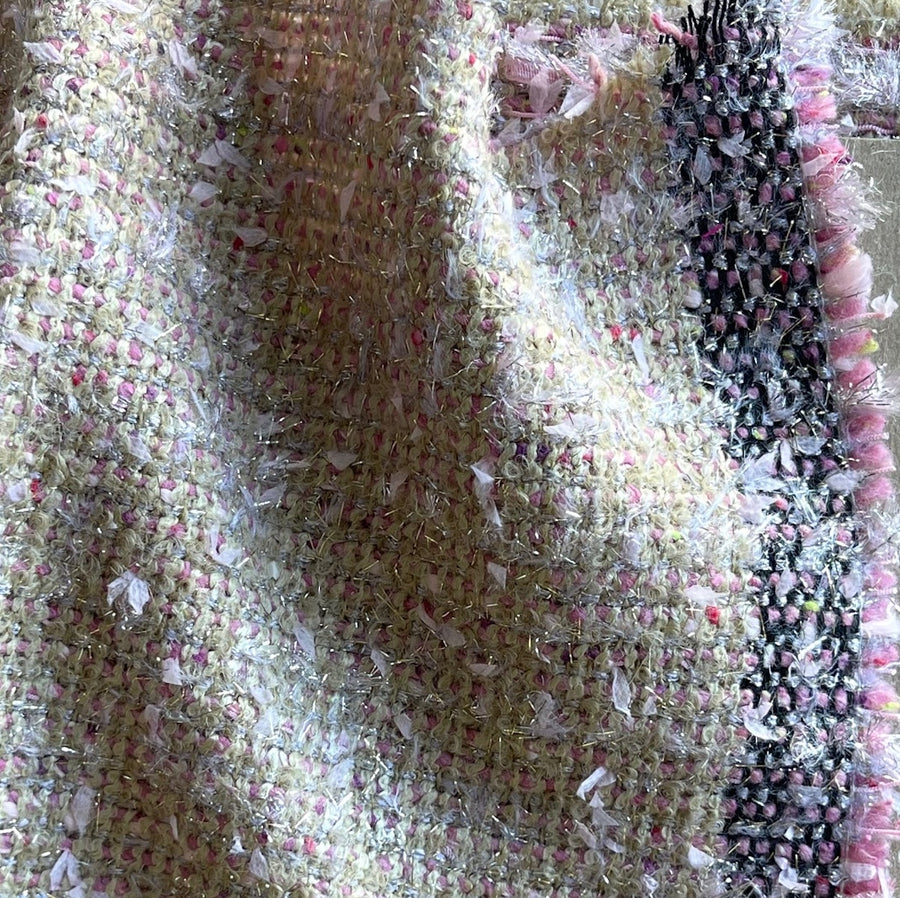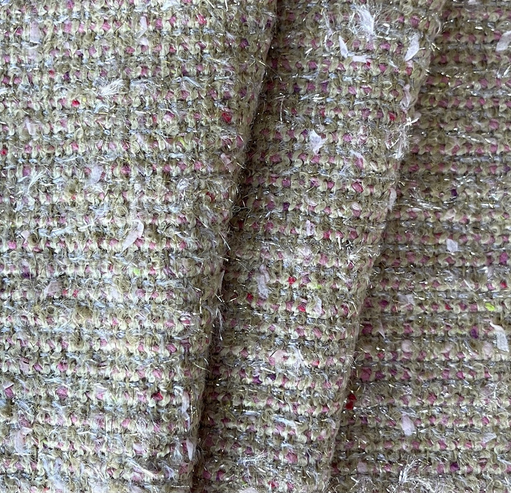 A sophisticated wool blend bouclé in shades of sand and clear rose pink with subtle silver metallic accents - this joyously textured bouclé with its decorative selvedges is perfect for a Chanel-style jacket, a skirt, or a wrap. Made by our favorite Spanish mill. Mohair, wool, acrylic, polyester, and metallic. 58" wide.