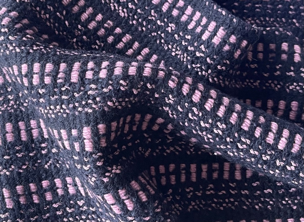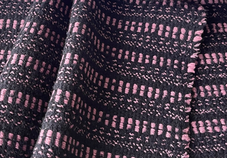 A high-end wool blend bouclé in pretty-in-pink and midnight navy stripes - this elegant bouclé is perfect for a grosgrain finished Chanel type jacket, skirt, or a light-weight duster. Made in Italy. 87% wool, 8% nylon, and 5% cotton. 54” wide.
