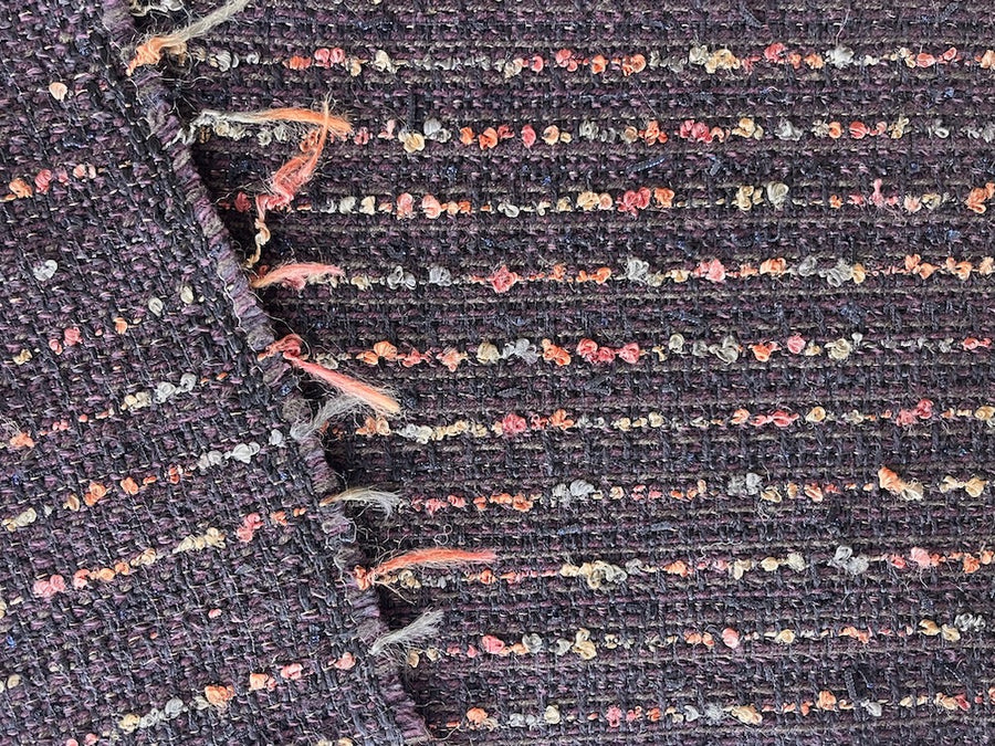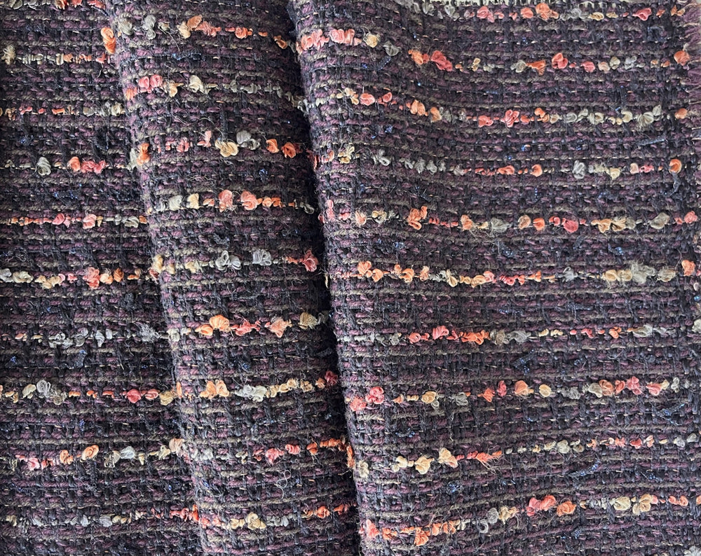 A mid-weight, sophisticated wool blend tweed bouclé in deep raisin and black crosswise stripes, accented with ribbons in autumnal colors - this airy bouclé is perfect for a Chanel type jacket , skirt, or a light-weight duster. Made in Italy. 60% wool and 40% viscose. 58” wide.