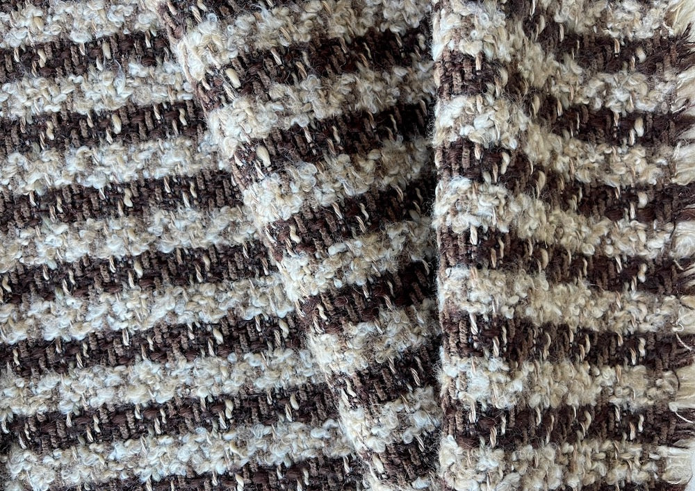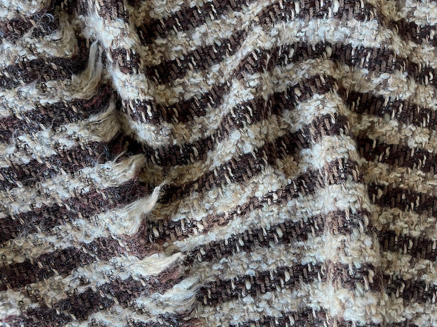 A mid-weight, sophisticated soft wool blend bouclé in shades of nutty russet brown and beige crosswise stripes - this airy bouclé is perfect for a Chanel type jacket , skirt, or a light-weight duster. Made in Italy. 70% wool and 30% polyester. 56” wide.