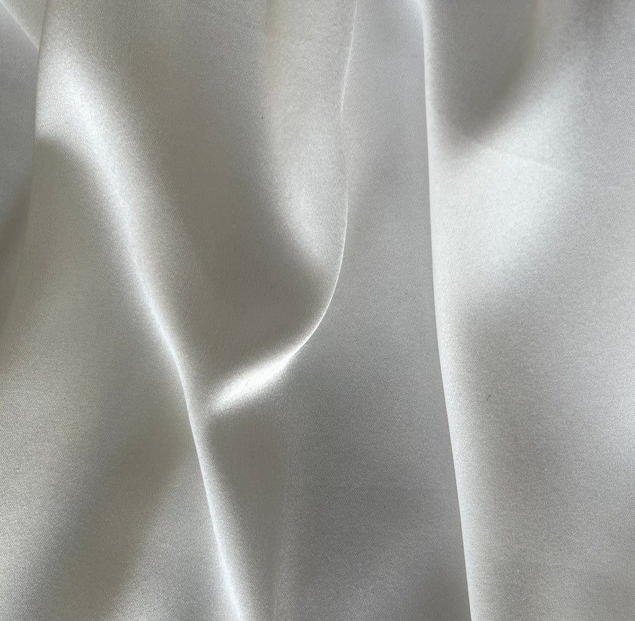 A gleaming stretch silk satin charmeuse in basmati rice white - with a touch of lycra for comfort, this fluid silk charmeuse is perfect for blouses, lingerie, wrap tops, anything bias-cut, or lining. Made in Italy. 96% silk and 4% lycra. 54" wide.
