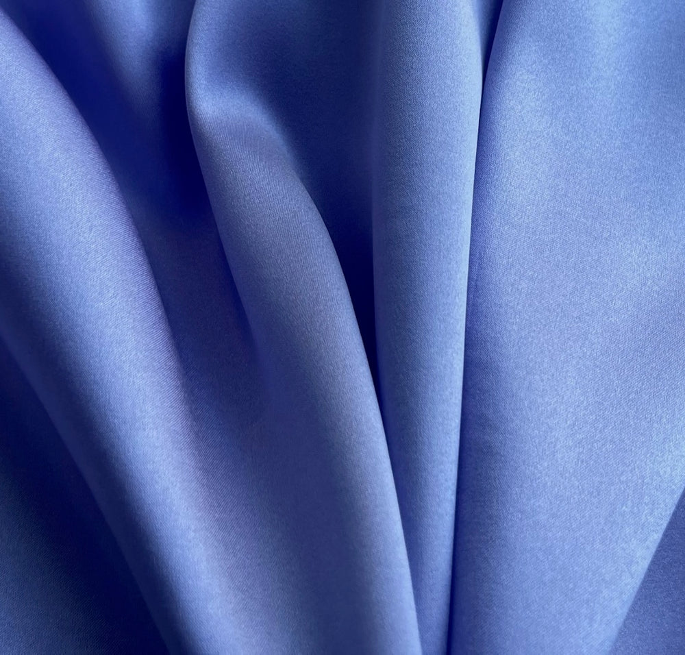 A gleaming stretch silk satin charmeuse in a romantic lilaced periwinkle - with a touch of lycra for comfort, this fluid silk charmeuse has liquid drape and is perfect for blouses, lingerie, wrap tops, anything bias-cut, or lining. Made in Italy. 96% silk and 4% lycra . 54" wide.