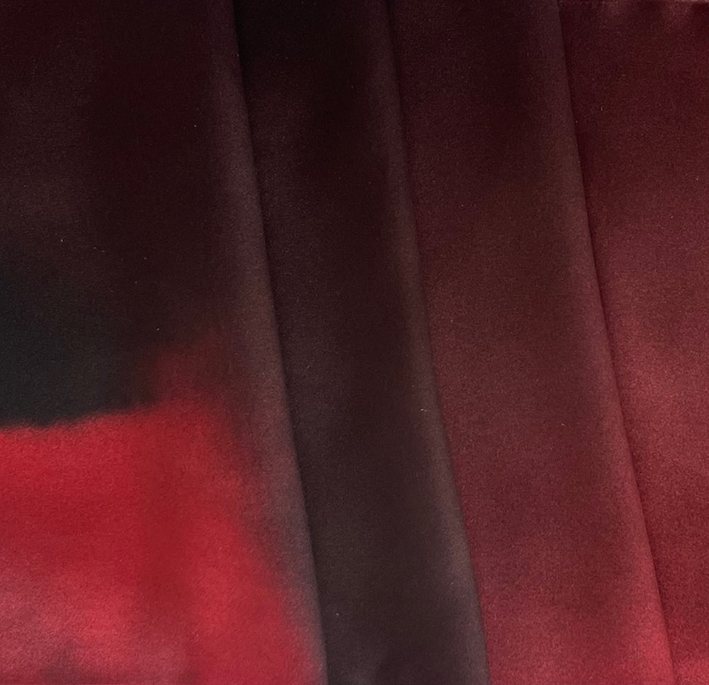 A silk satin charmeuse in a dark swirling flambé of brick red, aubergine, and sangria ombré - with liquid fluidity, this gorgeous silk charmeuse is perfect for a wrap-front blouse, a chic kimono, silky lounge-wear, swimwear cover-up, or a summer dress. Made in Italy. 100% silk. 54" wide.