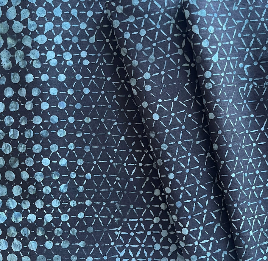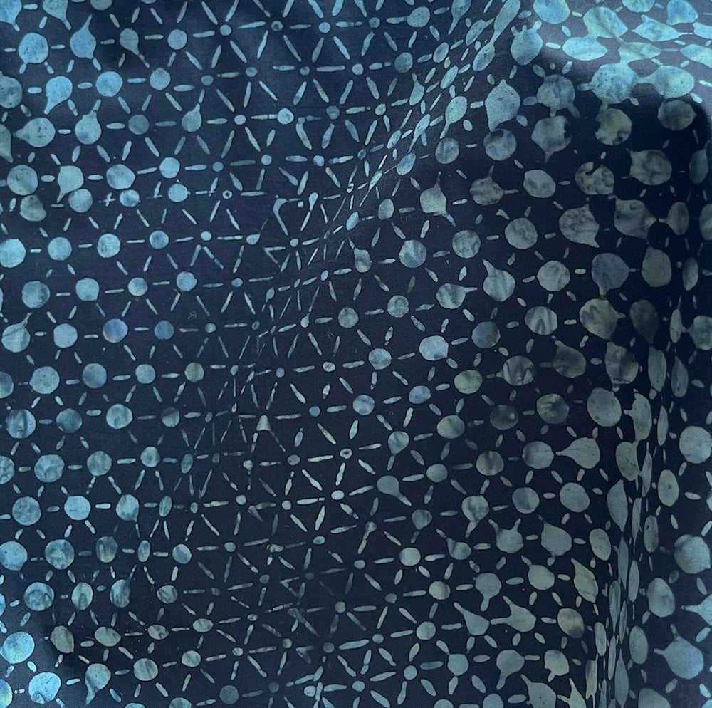 A tightly woven, soft cotton batik, with a poplin hand, in a print of interconnected dots in shades of smokey teal on a black background.