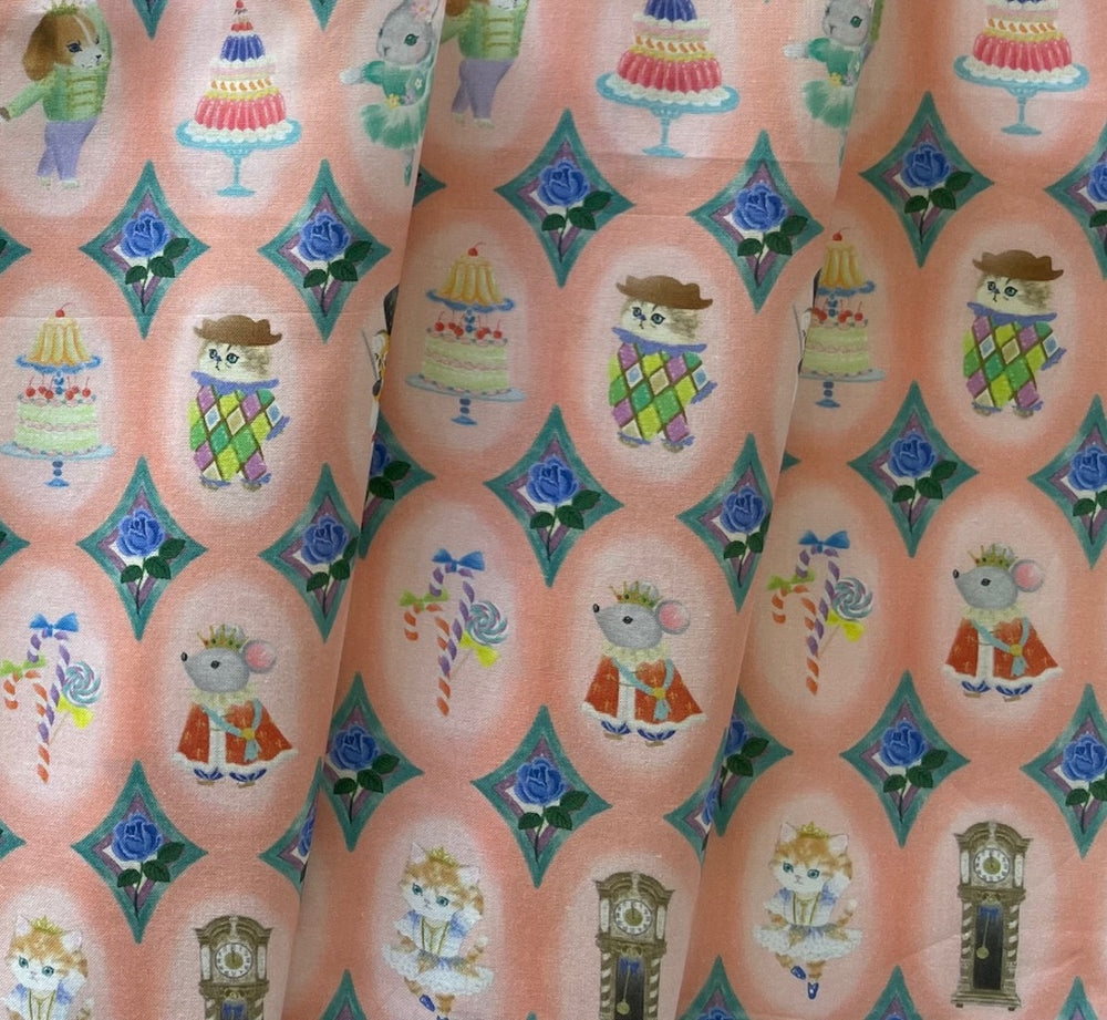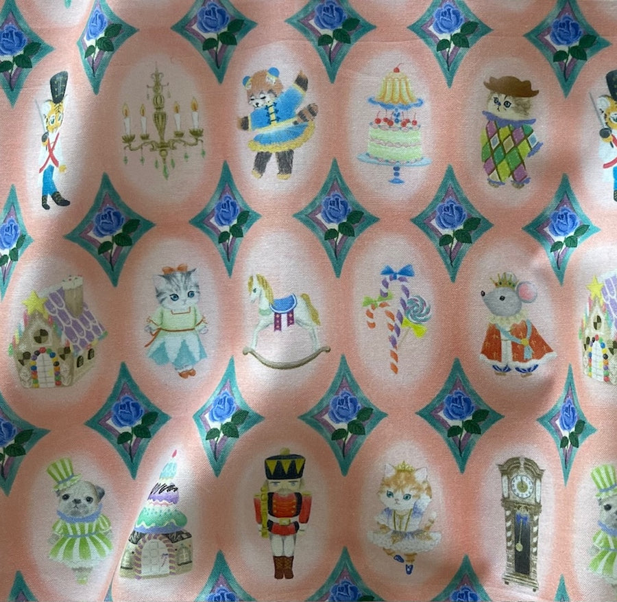 A light-weight cotton lawn in a print of Nutcracker creatures, toys, and festive cakes in ballet pink ovals and interspersed with blue roses - this smooth and airy cotton lawn would make a lovely sundress, shirt, or blouse. Made in Japan. 100% cotton. 44" wide.