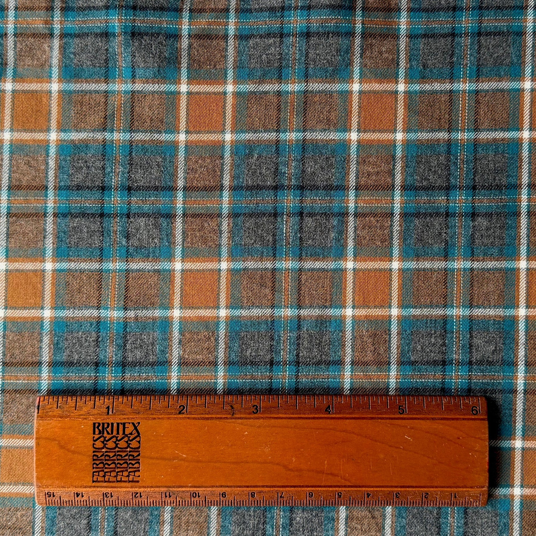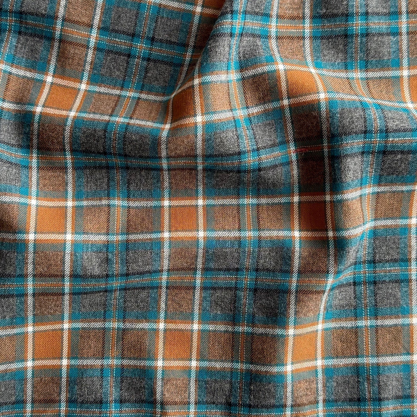 A mid-weight handsome cotton shirting in a ginger, turquoise, and grey plaid - this cozy, lightly brushed cotton is perfect for a blouse, table linens, or a shirt. Made in Japan. 100% cotton. 60" wide.