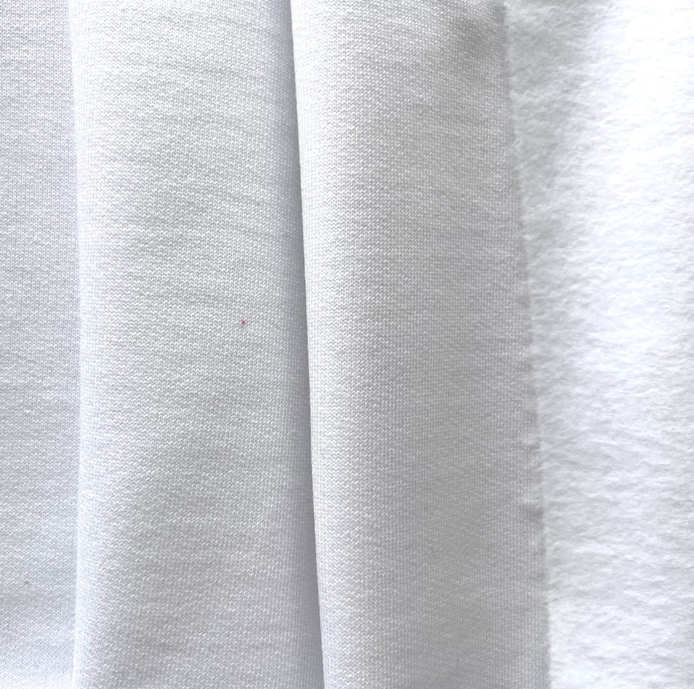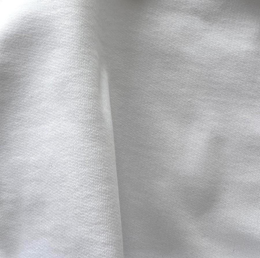 A cotton sweatshirt knit in bright white - with a smooth front and plush fleece back, this sweatshirting is the perfect weight for a comfortable dress, sweat pants, loungewear, or hoodies. Made in Italy. 100% cotton. 66" extra wide.