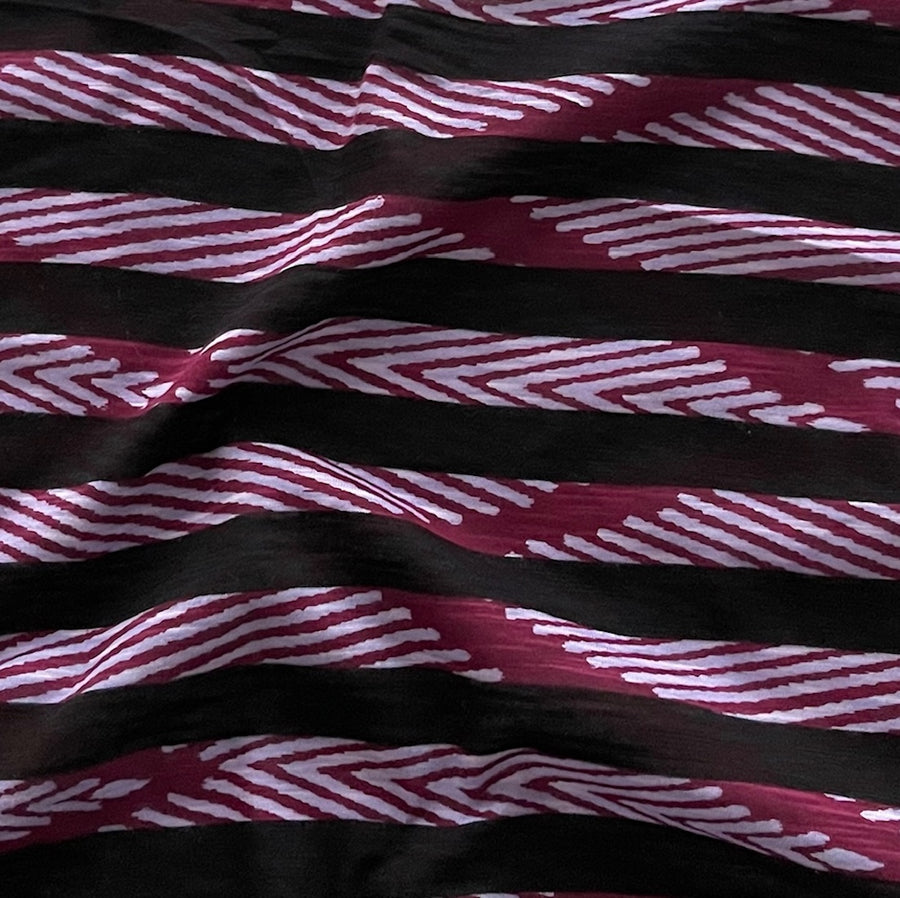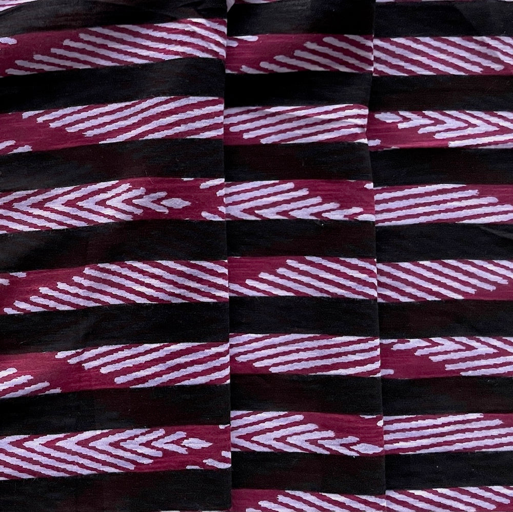 A high-end lightweight cotton tissue jersey knit in print of lilac and wine zig-zags camouflaged by black stripes - this buttery softy knit is perfect for a knit top, scarf, or comfortable sleepwear. Made in Japan. 100% cotton. 54" wide.