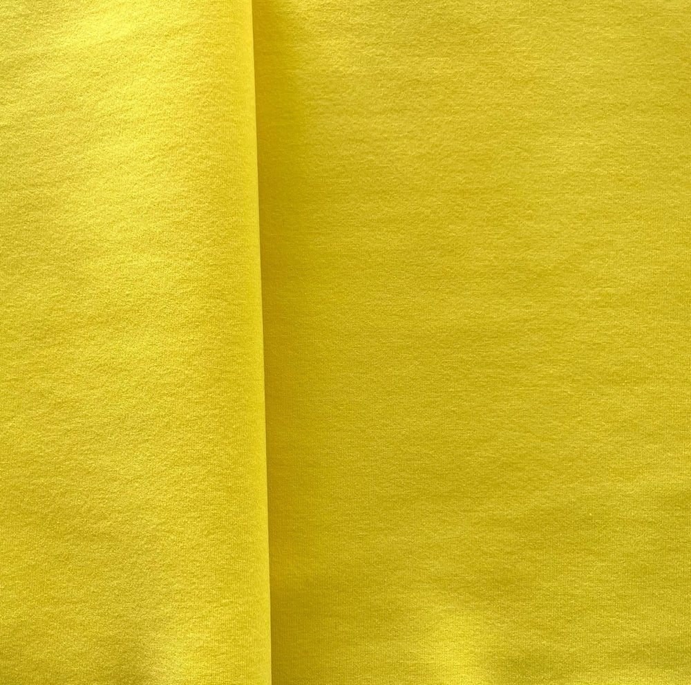 A scrumptious heavy-weight cotton blend knit in bright taxicab yellow - this sturdy, buttery soft cotton knit is the perfect weight for overalls, jumpsuits, stylish barn coats, or jackets. 65% cotton, 30% polyamide, and 5% lycra. 64" wide.