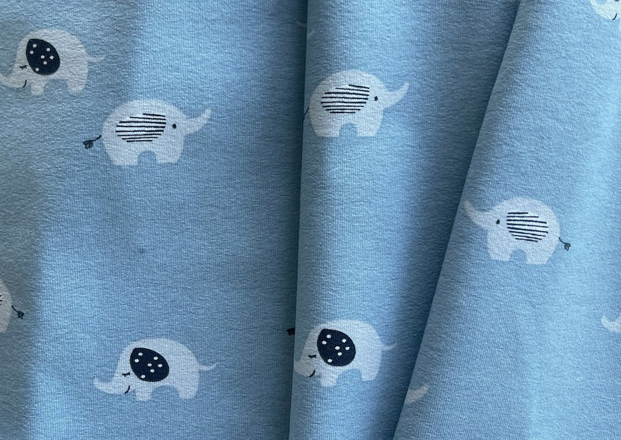 A cotton knit with sweet lucky elephants on a sky blue background - this soft and smooth knit is great for tops, pajamas, sportswear, or children's rompers. Made in the Netherlands. 95% cotton and 5% lycra. 58" wide.
