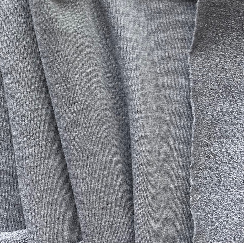A high-end, mid-weight cotton French terry knit in heathered Koala grey - smooth on the front and with a terry back, this soft cotton French terry is the perfect weight for athleisure wear, travel-wear, hoodies, comfortable tops, or joggers. Made in Italy. Cotton and lycra. 62" wide.