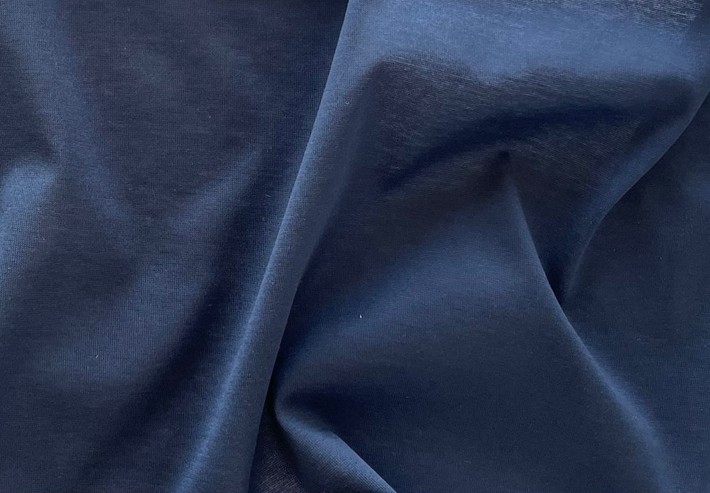 A semi-sheer cotton lisle knit in classic commodore navy blue - this beautifully finished, buttery soft cotton knit is the perfect weight for tops, a wrap, lounge-wear, or T-shirts. Washable. Made in Italy. 100% cotton. 58" wide.