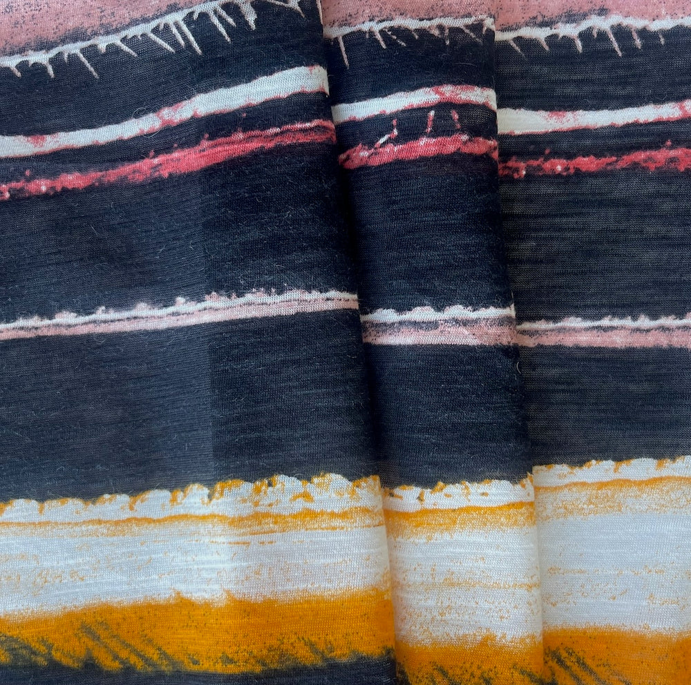 A high-end lightweight cotton tissue jersey knit with crosswise, serraterd, irregular marigold, coral , blush, black, and white stripes - this buttery soft knit is perfect for a knit top, scarf, or comfortable sleepwear. Made in Japan. 100% cotton. 56" wide.
