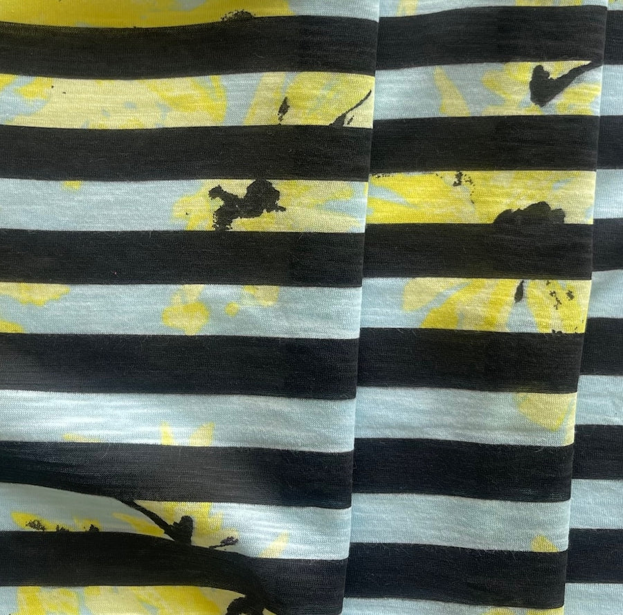 A high-end lightweight cotton tissue jersey knit with crosswise black and pale sky blue stripes hiding lemon yellow flowers - this buttery soft knit is perfect for a knit top, scarf, or comfortable sleepwear. Made in Japan. 100% cotton. 54" wide.