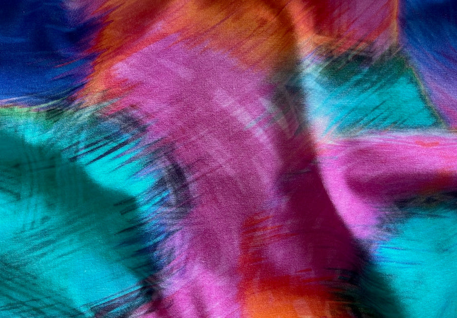 A cotton knit a vibrant abstract print of summer jeweled skies in shades of bubblegum pink, lime, orange, turquoise, and red  -  this soft and smooth knit is great for tops, pajamas, sportswear, T-shirts, or children's rompers. Made in the Netherlands. 95% cotton and 5% lycra. 56" wide.