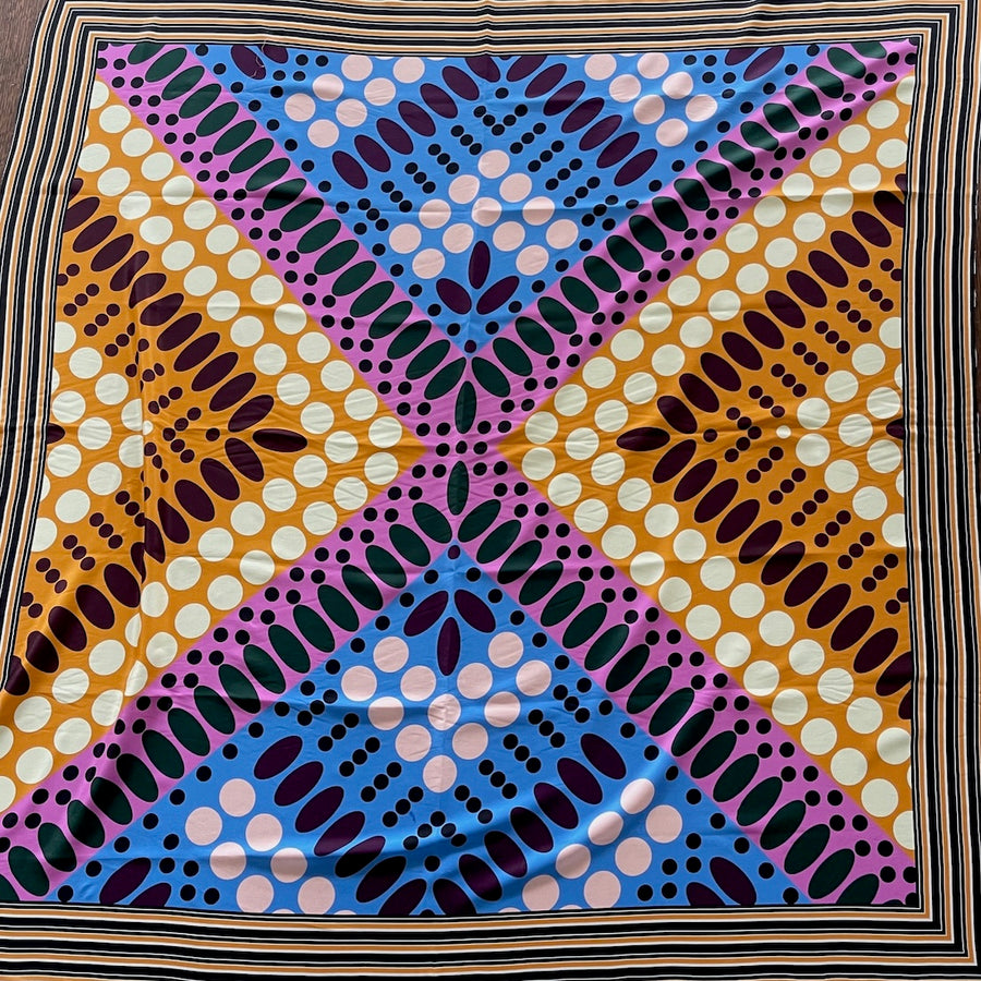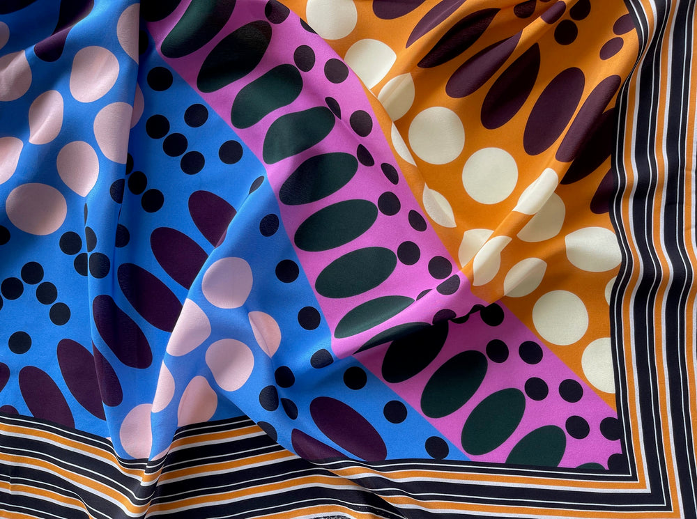 A fantastical silk crepe de chine 54" square panel in a Yayoi Kusama-inspired dotted pattern - this dramatic panel would make an exquisite scarf, a stunning paneled skirt, or a dress. Made in Italy. 100% silk. 54" wide.