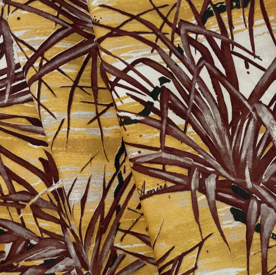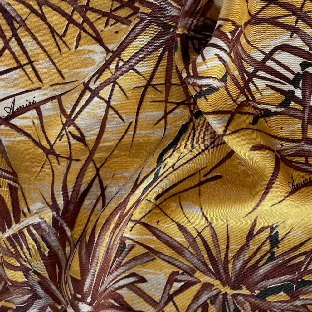 A signature Amiri silk twill in a print of chocolate palm fronds on a goldenrod background - this ethereal, fluid silk is perfect for blouses, caftans, elegant robes, or wide-legged pants. Made in Italy by Amiri . 100% silk. 54" wide.