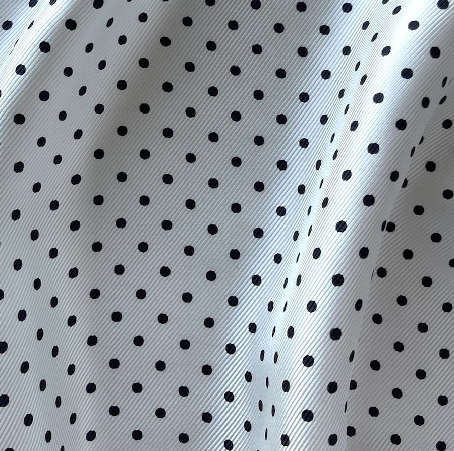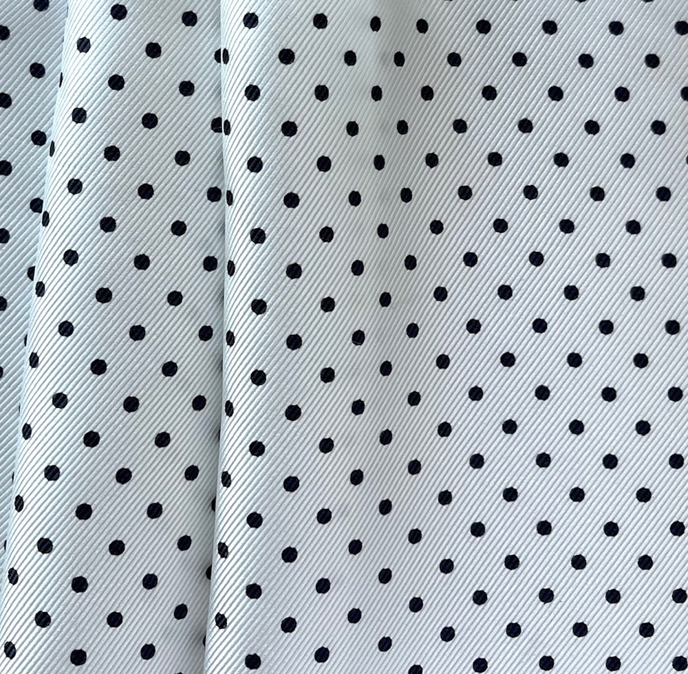 A lovely silk twill in a print of black polka dots on a bright white background - this classically charming silk is perfect for blouses, elegant robes, pajamas, or wide-legged pants. Made in Italy. 100% silk. 40" wide.