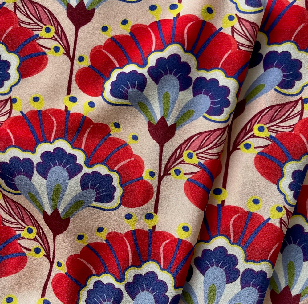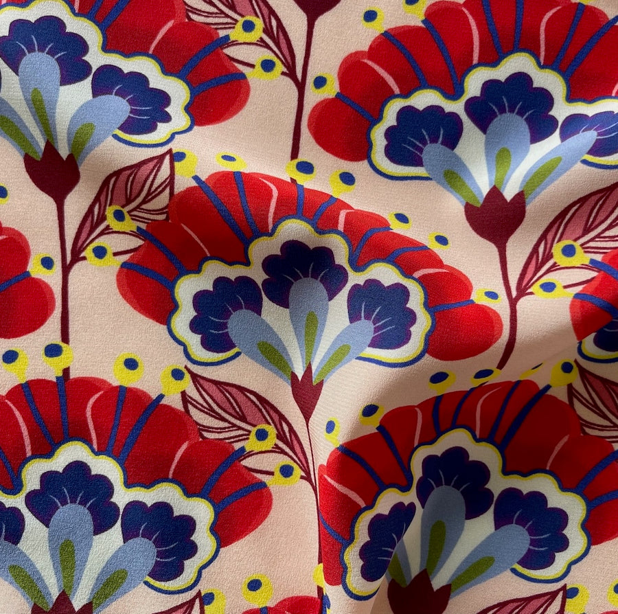 A glamorous stretch silk crepe de chine in a Art Deco-inspired print of Merlot and cobalt fan-shaped flowers on a blushing peach background- with a touch of lycra, this alluring silk is perfect for blouses, elegant robes, or wide legged drawstring pants. Made in Italy. 93% silk and 7% lycra. 54" wide.