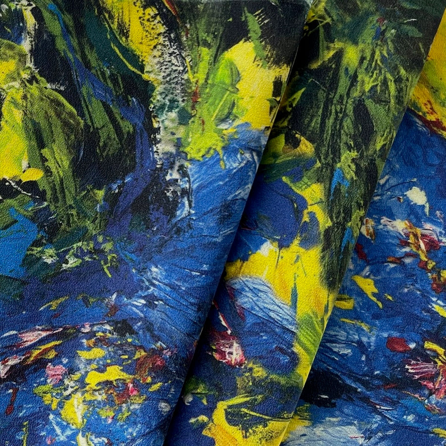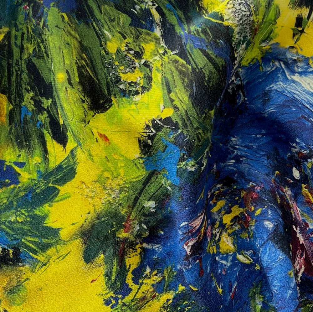 A high-end silk crepe de chine in a movement-filled, dramatic painterly print of cobalt and bumblebee yellow flowers, with green and black accents - this tightly woven, fluid silk is perfect for blouses, caftans, light robes, or wide-legged pants. Made in Italy. 100% silk. 54" wide.