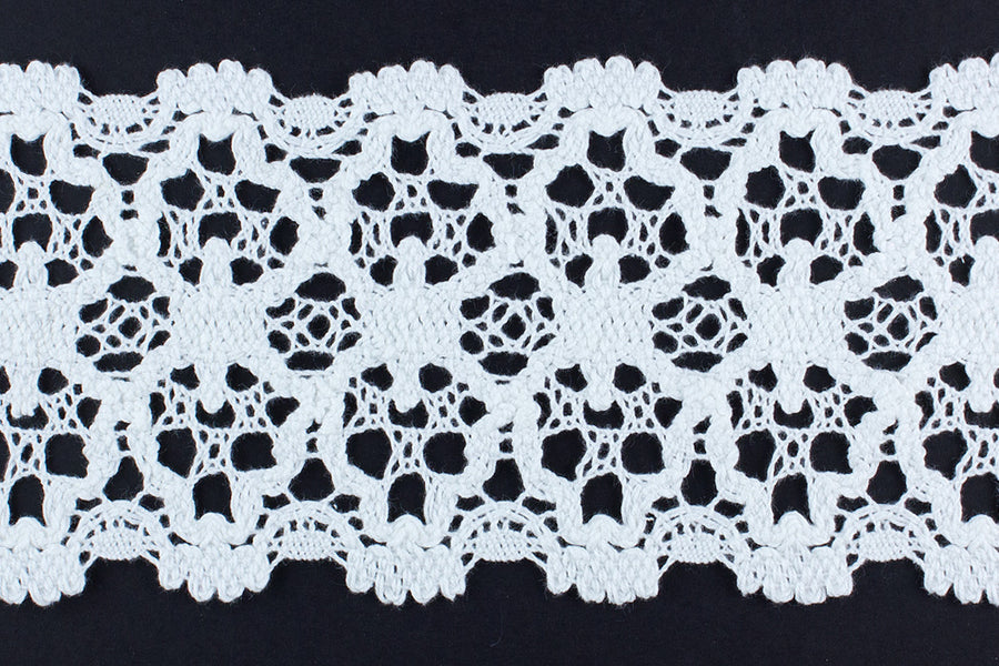3 1/2" wide white crochet lace; a beautiful pattern with six-legged starfish running through the center and two scalloped edges. 100% cotton. Made in England.