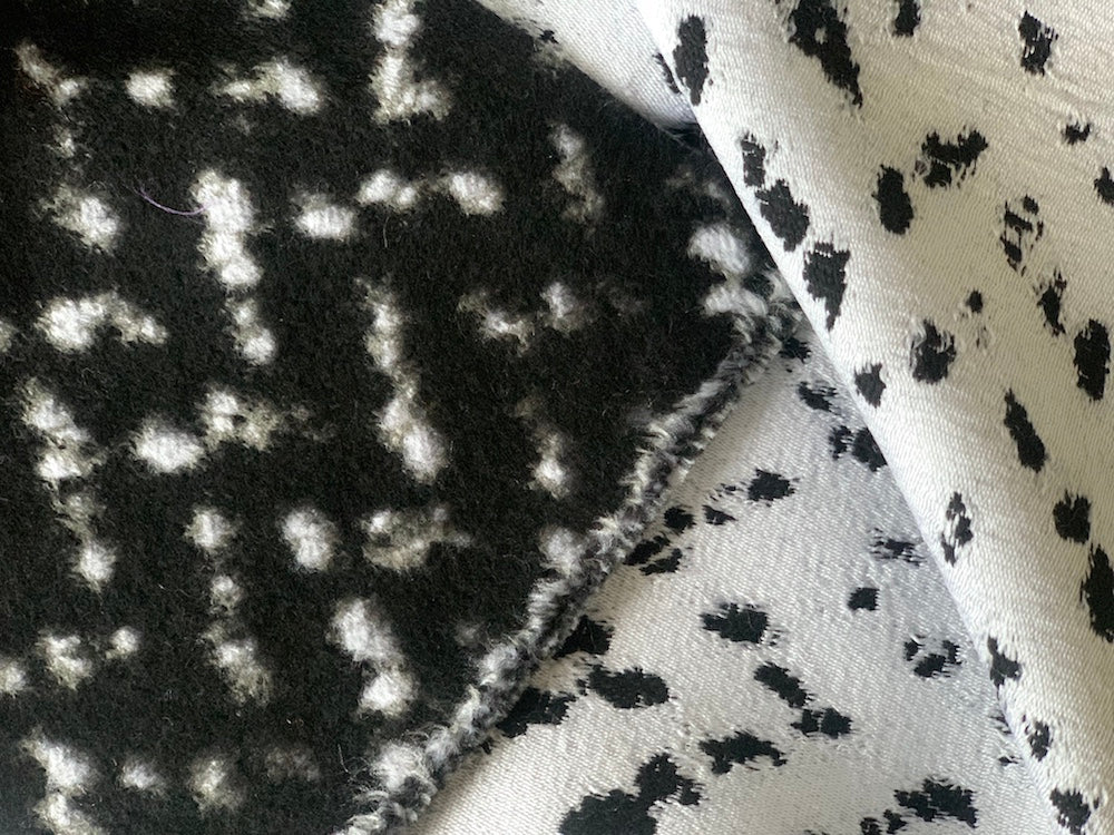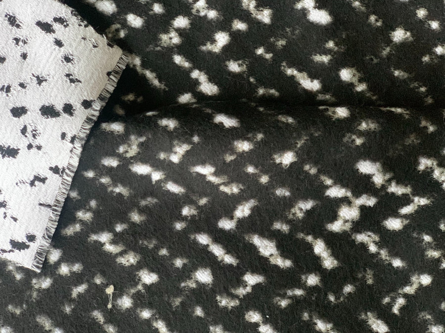 A dramatic double-faced wool blend coating in Dalmatian-inspired black and white - perfect for a fun long coat or a hooded jacket...showcase the reverse side by trimming the pockets and cuffs! Made in Italy and used by Aquilino Rimondi. 40% silk, 35% polyester, and 25% wool. 55" wide.