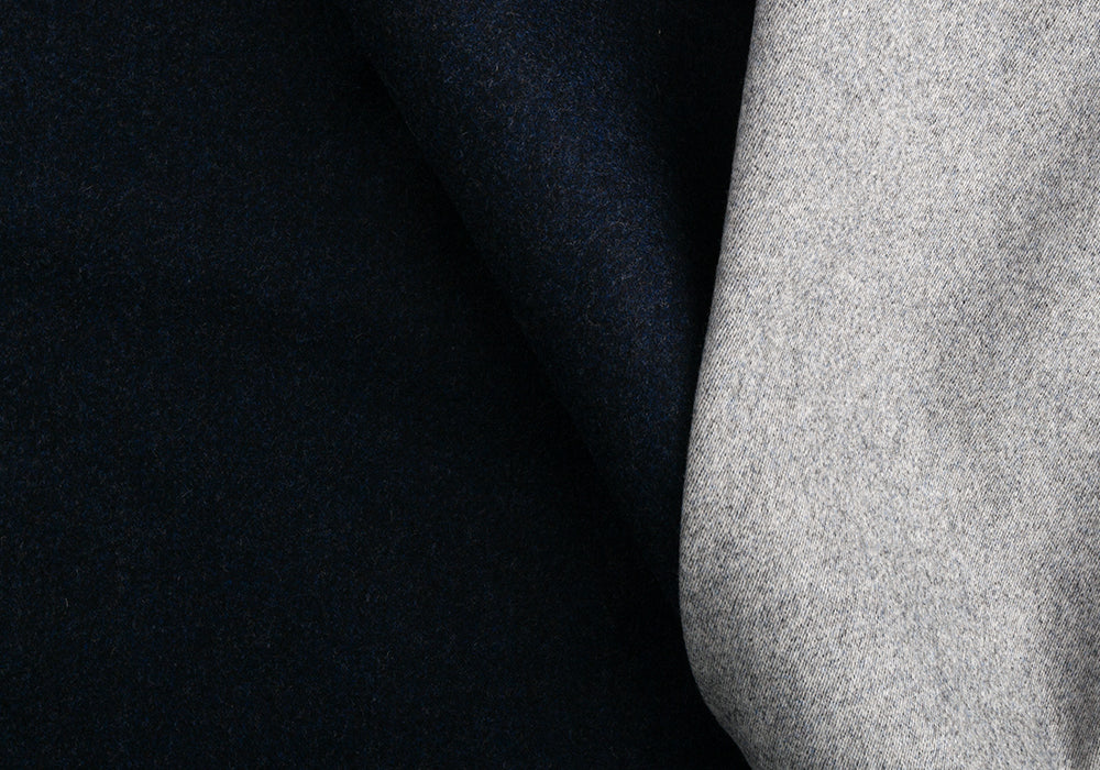 A soft, double-faced, reversible virgin wool coating in heathered indigo denim shade on one side and a soft gray heather on the reverse - easy to wear and versatile, this wool coating would be excellent for an overcoat. Made in Italy. 100% virgin wool. 61" wide.