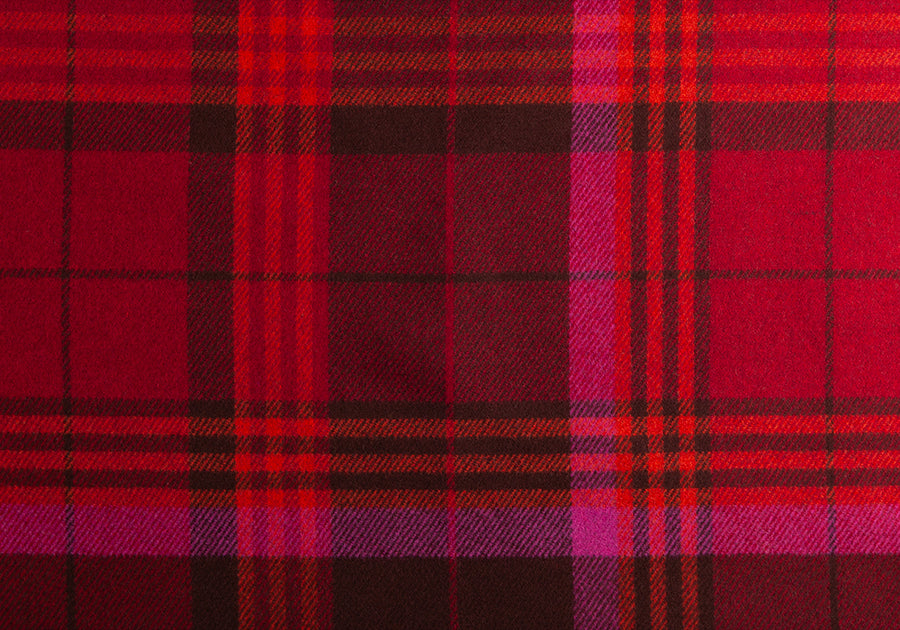 A soft reversible wool blend coating; brown, red, and hot pink plaid on the front and warm chocolate brown on the back - this wool coating would be excellent for a coat or jacket. 80% wool and 20% polyester. 61" wide.