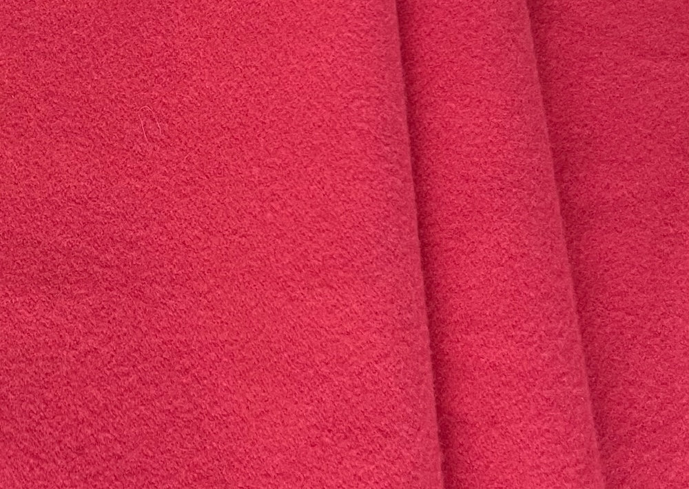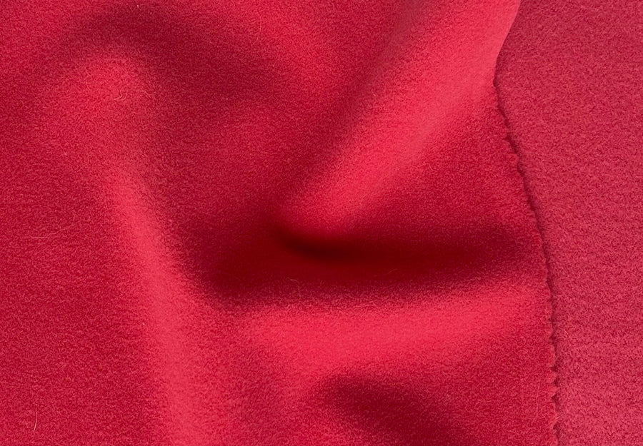 A couture, mid-weight, double-faced wool melton coating in luscious watermelon red - this luxuriously plush, high-end melton is perfect for a wrap coat, overcoat, or a jacket. Made in Italy for Valentino. 100% wool. 60 wide.