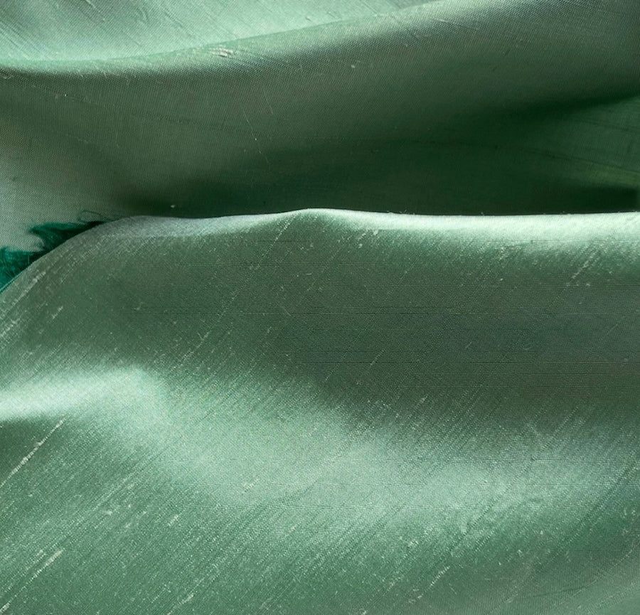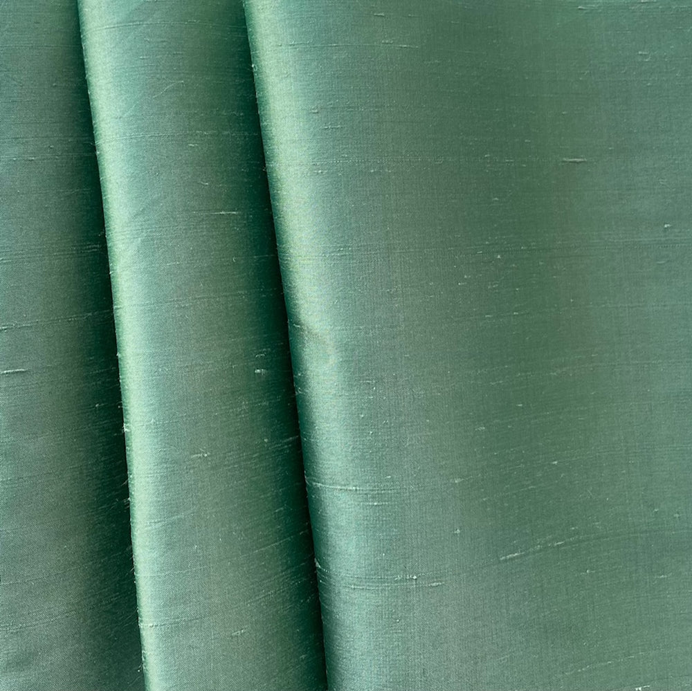 An iridescent, crisp silk dupioni in a fresh castleton green shot with celadon - this elegant, slubby silk is stunning for dresses, blouses, slim slacks, or pillows. Made in India. 100% silk. 45" wide.