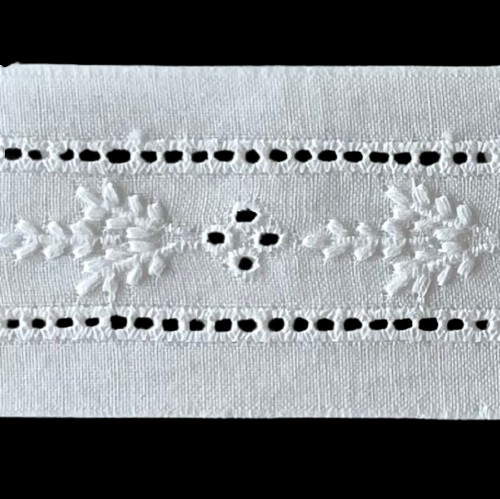 1 1/8" wide white eyelet lace trim with a center row of embroidered sprigs and dots flanked by two narrow rows of faggoting. Raw edges. 100% cotton. Made in Switzerland.