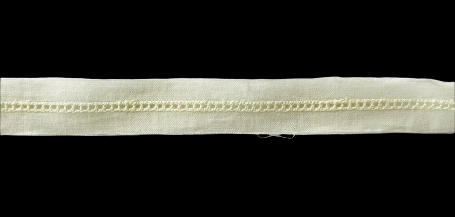 3/4" wide ivory eyelet insertion lace trim with a narrow row of faggoting and two raw edges. 100% cotton. Made in Switzerland.
