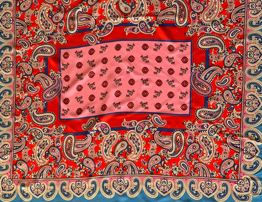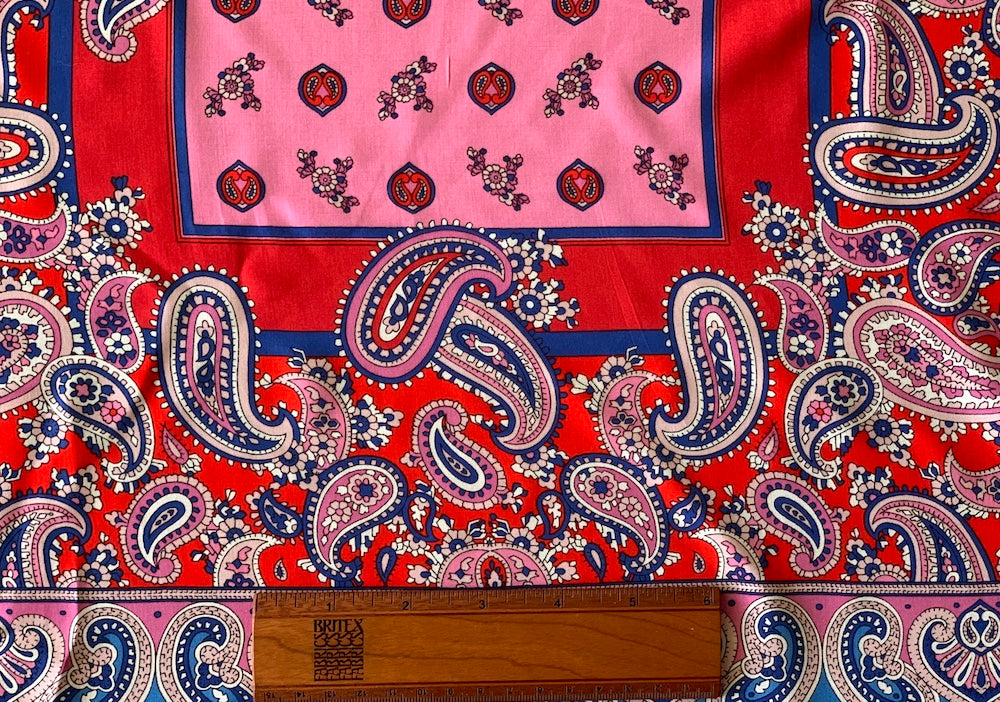 A charming viscose scarf panel, with a perky paisley print in shades of red, rose, blue, and cream. Sold by the panel and each panel consists of two 20" by 30" scarves! Made in Italy. 100% viscose. No swatches.