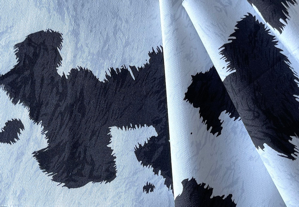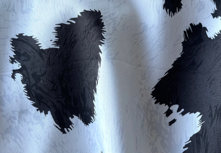 A mid-weight cotton twill suiting in a black and white cow print with pale smoke grey shadowed accents - this modern print is perfect for spring jackets, slacks, or overalls. 100% cotton. 56" wide.