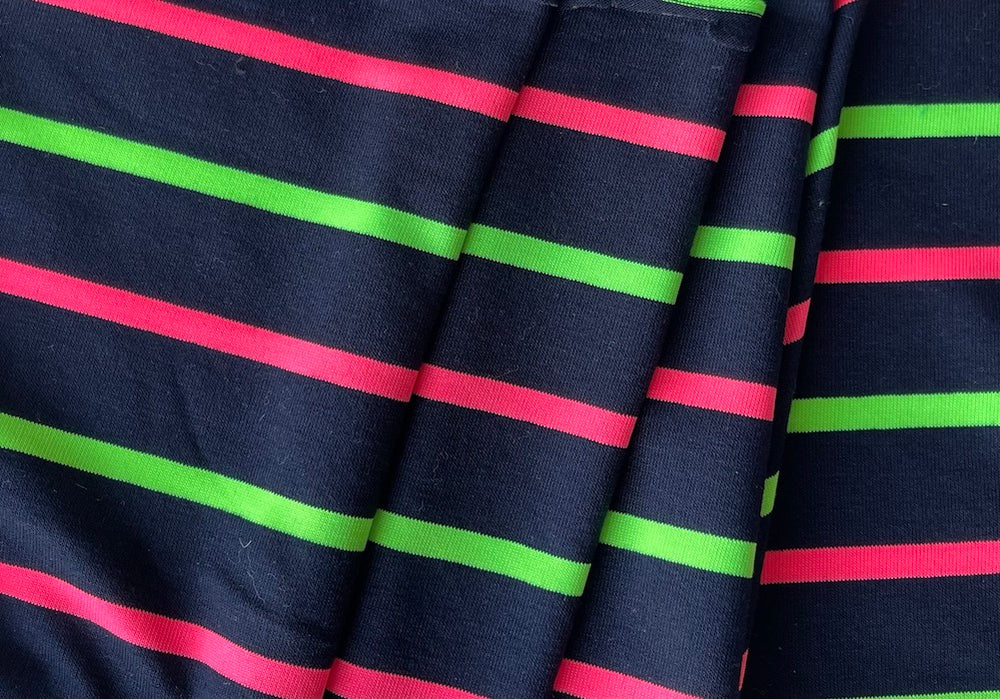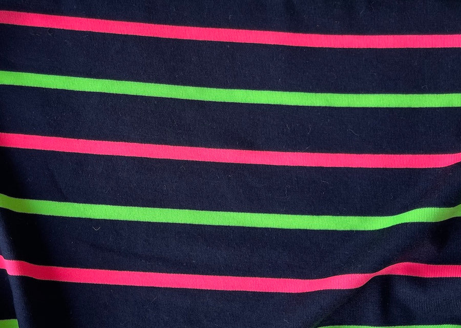 A soft rayon viscose jersey knit in print of florescent pink and green stripes against a black background - perfect for T-shirts, leggings, or comfy caftans. Smooth, cold water wash. Made in Italy. 96% rayon viscose and 6% lycra blend. 72" wide.